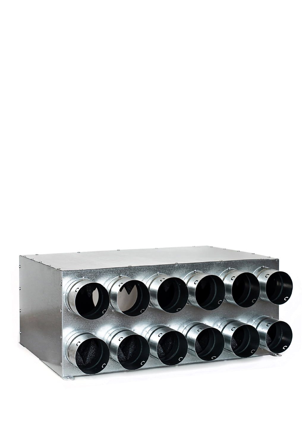 Kolektorinė oro paskirstymo dėžė su akustine izoliacija. Pajungimai: 12 x 75 mm, d160 arba d200. Išmatavimai: 564 x 370 x 230 mm (arba 235 mm, kai pajungimas d200) (IxPxA).